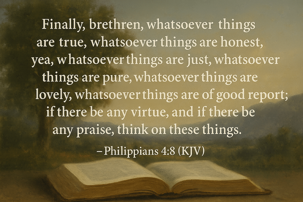 “Finally, brethren, whatsoever things are true, whatsoever things are honest, whatsoever things are just, whatsoever things are pure, whatsoever things are lovely, whatsoever things are of good report; if there be any virtue, and if there be any praise, think on these things.”
